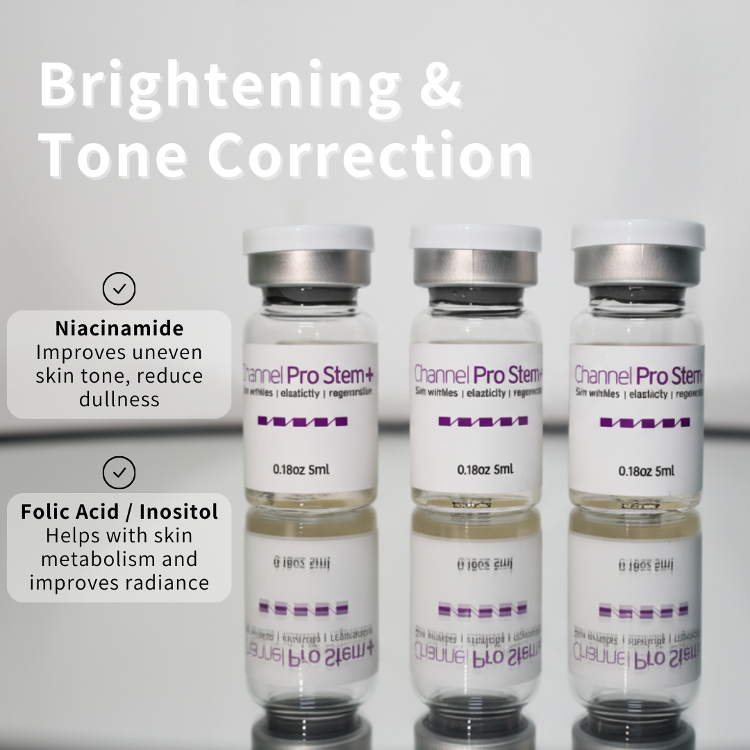 Channel Pro Stem+ is an ampoule designed to support skin regeneration, enhance luminosity, and harmonize uneven skin tone. Formulated with stem cell conditioned media, plant-derived extracellular vesicles, amino acids, and multi-vitamins, it delivers soothing, moisturizing, and revitalizing benefits. Safe, stable, and non-irritating — ideal for microchanneling and professional skin treatments.