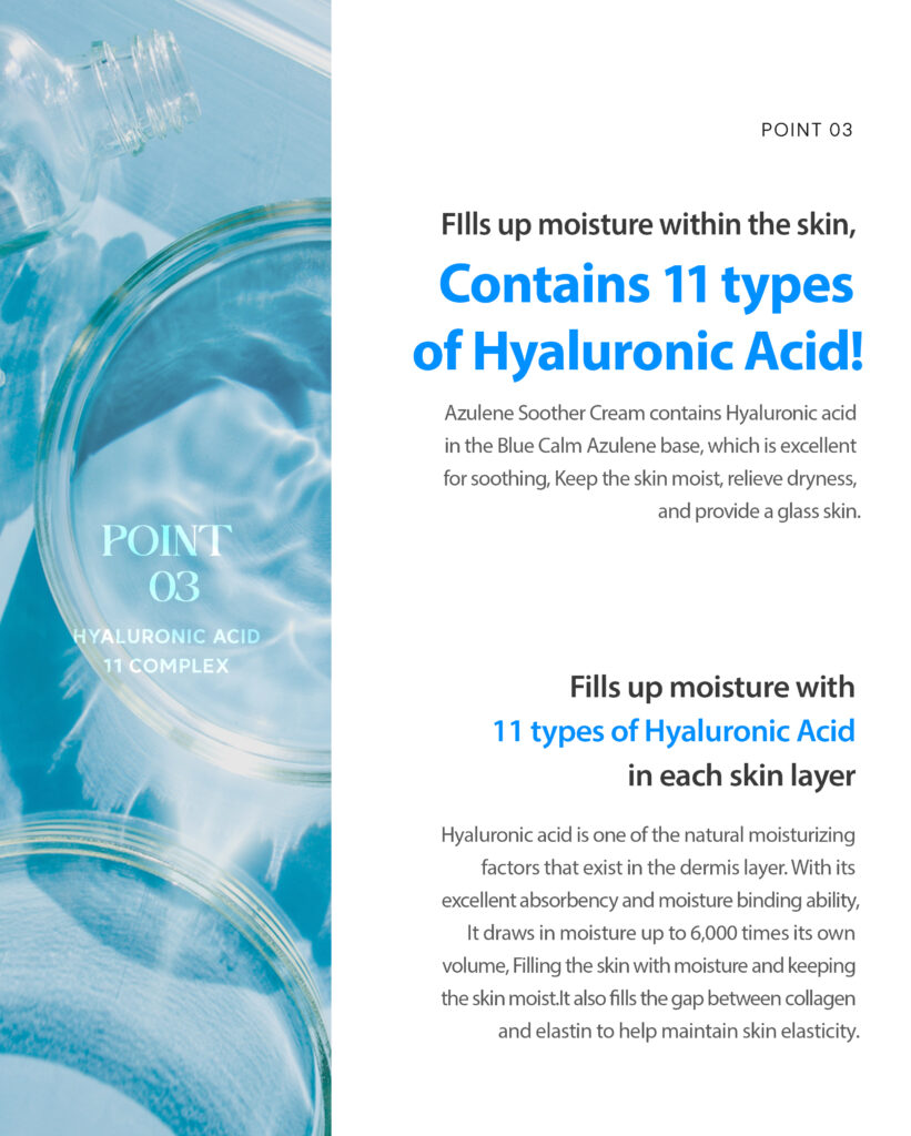 Camellia Water (76%), Glycerin, Isopropyl Myristate, Betaine, 1,2-Hexanediol, Butylene Glycol, Dimethicone, Pentaerythrityl Tetraisostearate, Hydrogenated Polydecene, Sorbitan Olivate, Sodium Hyaluronate Crosspolymer, Sodium Acetylated Hyaluronate, Hydrolyzed Sodium Hyaluronate, Hydroxypropyltrimonium Hyaluronate, Hydrolyzed Hyaluronic Acid, Hyaluronic Acid, Potassium Hyaluronate, Hydrolyzed Glycosaminoglycans, Guaiazulene (1,000 ppm), Dipotassium Glycyrrhizate, Centella Asiatica Extract, Houttuynia Cordata Extract, Bifida Ferment Lysate, Saccharomyces Ferment Filtrate, Rosa Centifolia Flower Extract, Asiatic Pennywort Extract, Portulaca Oleracea Extract, Allantoin, Squalane, Trehalose, Trideceth-12, Dimethicone/Vinyl Dimethicone Crosspolymer, C12-13 Alkyl Lactate, Niacinamide, Adenosine, Polysorbate 60, Caprylic/Capric Triglyceride, Tocopheryl Acetate, Tromethamine, Acrylates/C10-30 Alkyl Acrylate Crosspolymer, Carbomer, Ethylhexylglycerin, Fragrance, Disodium EDTA, C12-13 Pareth-3.